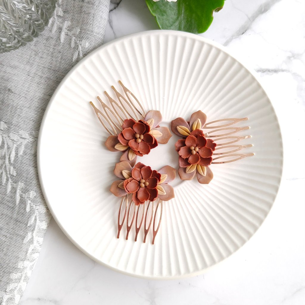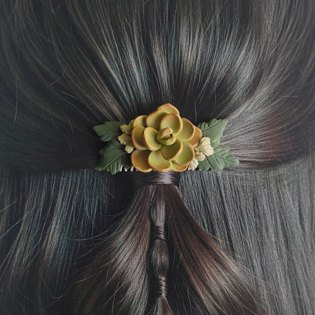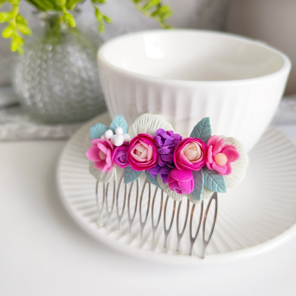 Ručně vyráběné ozdoby z polymerové hmoty připevněné na kovovém hřebínku.