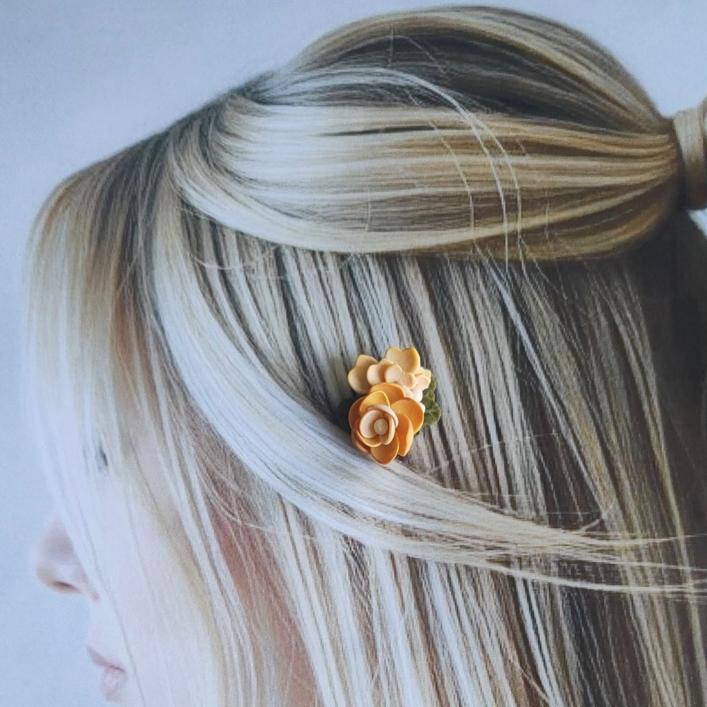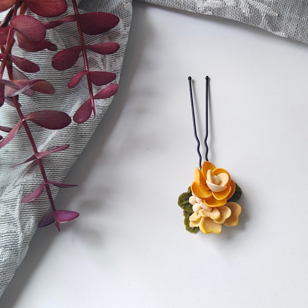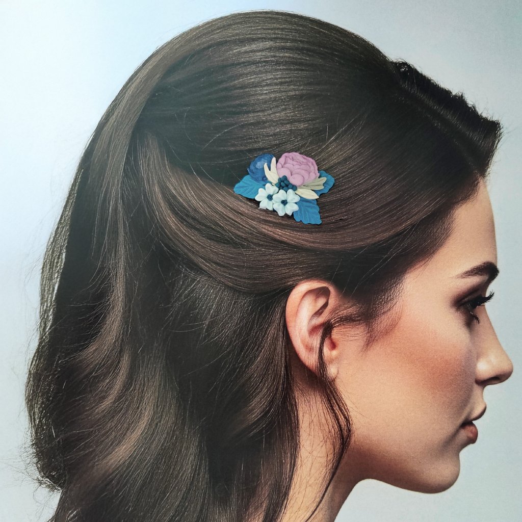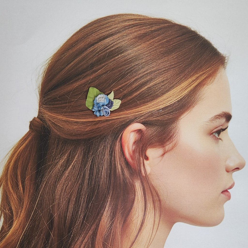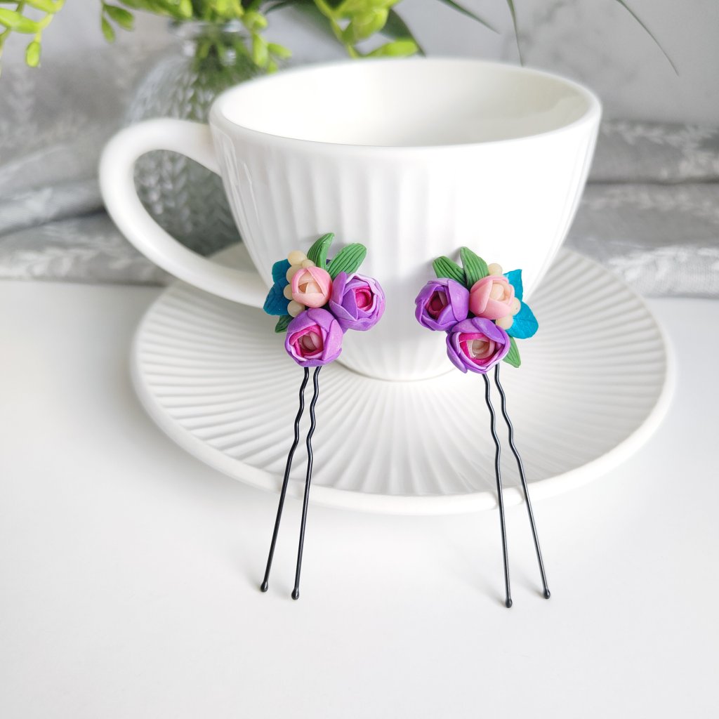 Set dvou vlásenek z poplastovaného kovu. Zdobeny švestkově fialovými květy z polymerové hmoty. Délka vlásenky je 6 cm.
